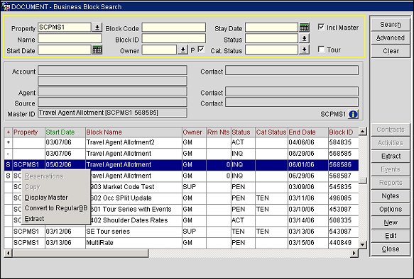 If this Business Block is not designated as a master or sub, you may make it a master by using the Create Master option from the Business Block Options menu. (The Business Block Options menu is available when you select the Options button from the Business Block Search screen or from the Business Block screen.) To access the Business Block Search screen, select Reservations>Blocks>Business Block. When the OPS<version number> OPERA Sales and Catering license is active, select Business Management> Business Block.) This option is only available to users with the Blocks>BLOCK NEW permission granted.