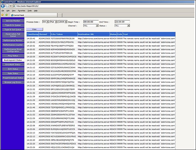 Displays the status of each Booking Limit record sent to the external ADS. Booking limit information allows for business continuity in case connectivity is lost between the GDS host and the OPERA database. You can search for the current or past dates and narrow the search by using the Begin and End times, Channel and message status.